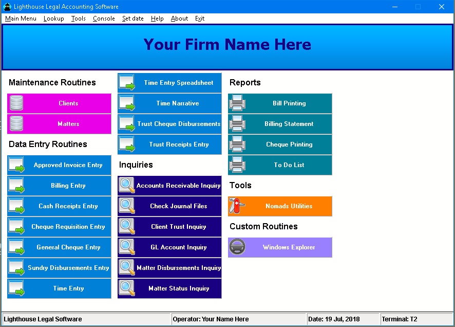 Central to the legal accounting system is the general ledger. The Chart of Accounts is easily established and maintained. Managers can determine if an account may be accessed via disbursement entry, cash receipts, General Ledger Journal entries, or via any combination of such entries. This feature greatly reduces the chance of accounts being posted in the wrong routines.