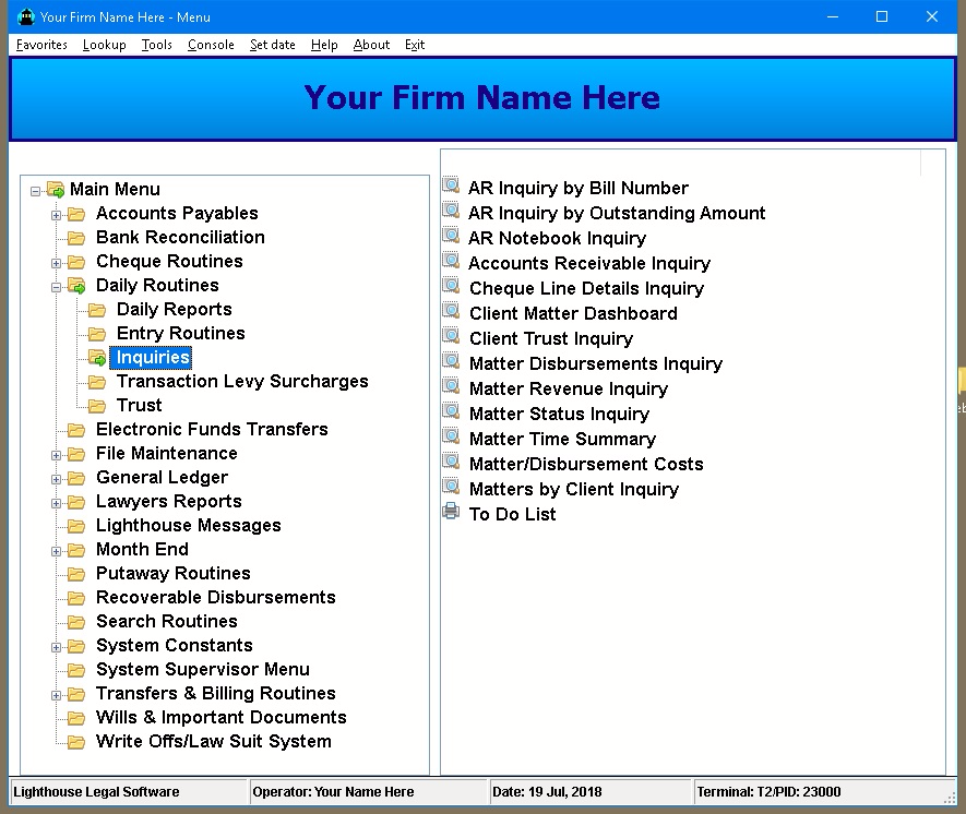 The Billing and Accounts Receivable routines are fully integrated with all other aspects of accounting. Therefore, the Matter Status Inquiry and the Billing Statement present a snapshot of the Client's Matter, including Accounts Receivable, Trust, Disbursements, and Unbilled Time.